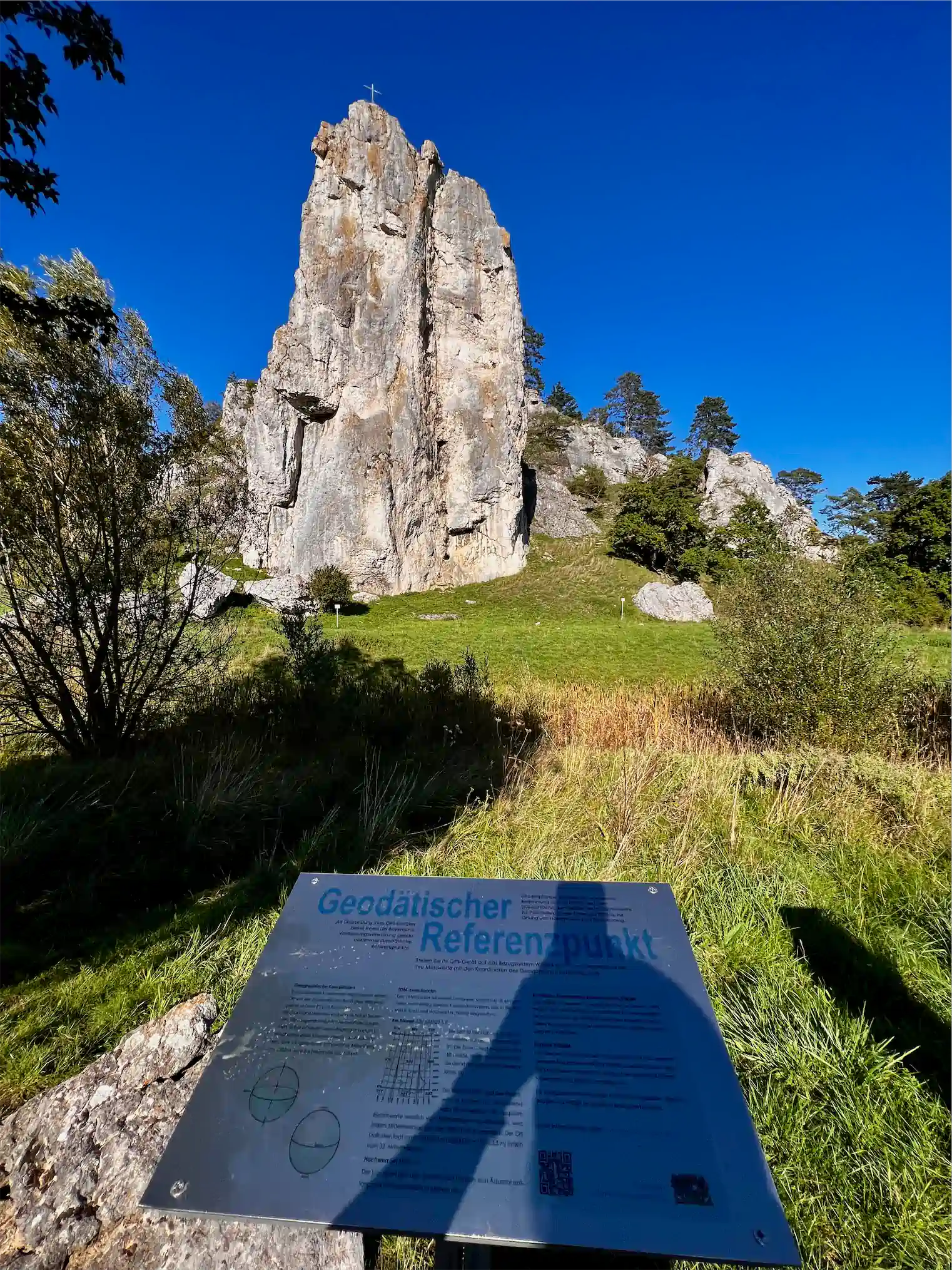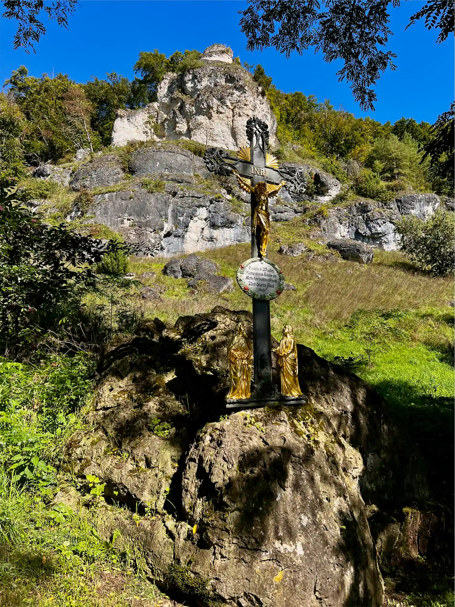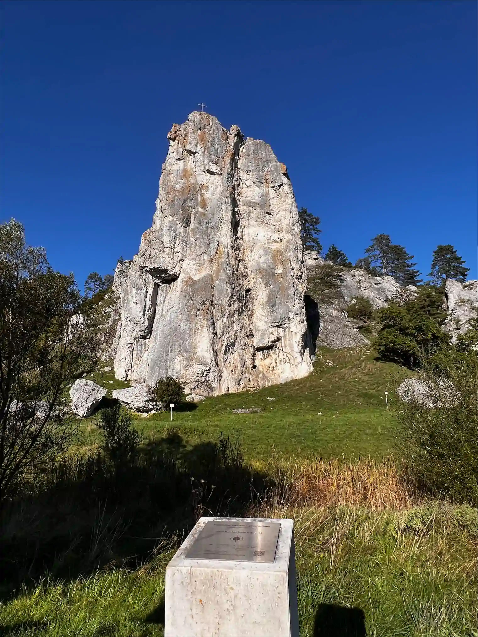 Der 50 Meter hohe Fels mit dem goldenen Kreuz auf der Spitze packt einen sofort. Es gibt dort auch einen Rastplatz mit Tisch und Bänken, man kann also gut eine Pause einlegen und den großen Kerl angemessen bewundern.