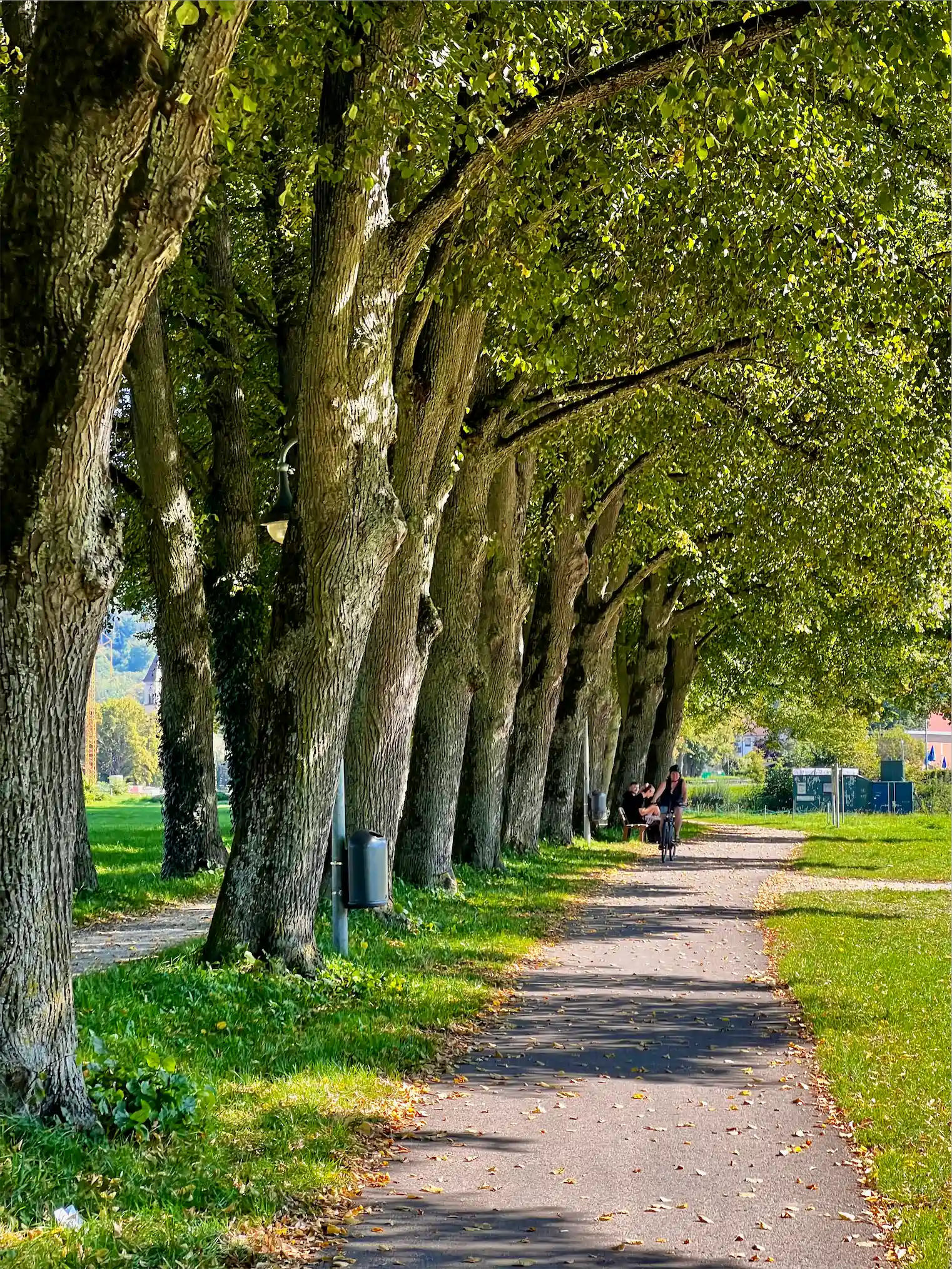 Über Solnhofen (wo die in deutschen Badezimmern so beliebten Solnhofer Platten herkommen) geht es weiter nach Pappenheim. Oben auf dem Bergrücken thront die Burg Pappenheim, und der Radweg in die Ortsmitte führt über eine sehr lange, absolut wunderschöne Allee.