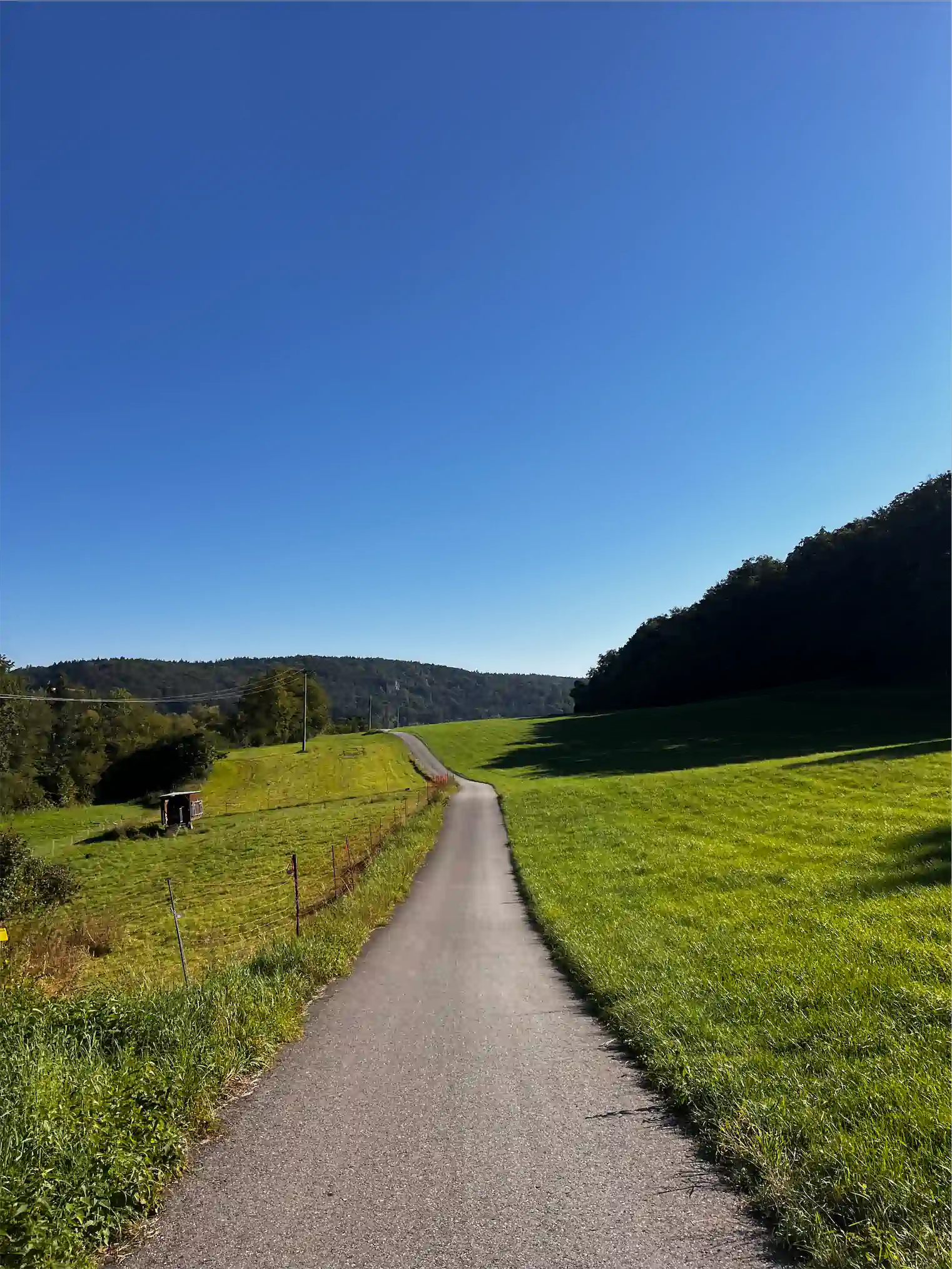 Herrlich, so in der frischen Morgenluft allein durch die sonnigen Wiesen zu radeln.