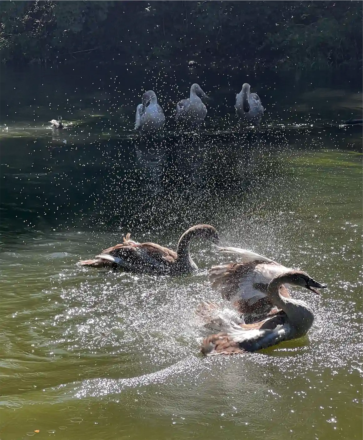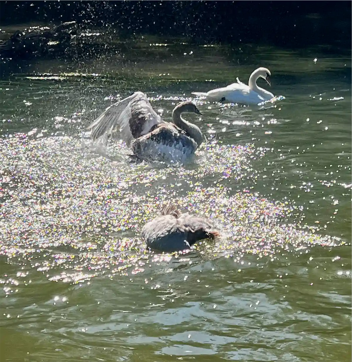 Wildes Flügelschlagen, Wasserplatschen und rumrollen. Wusste gar nicht, daß Schwäne so albern sein können... Immer, wenn die Strömung sie ein Stück abgetrieben hatte, kamen sie zurückgeschwommen und das ganze Schauspiel fing von vorne an.
