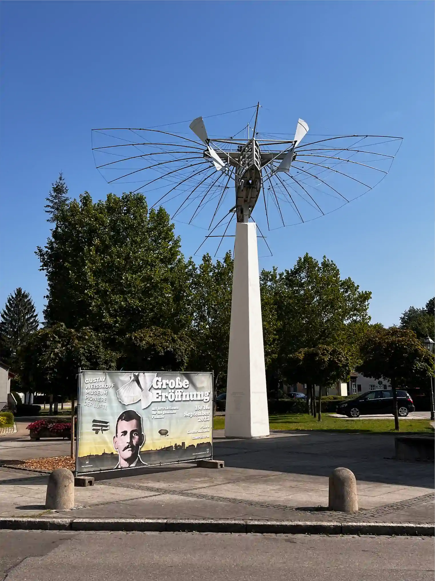 Interessant ist auch das Gustav Weisskopf "Museum Pioniere der Lüfte" im kleinen Ort Leutershausen. Mitten im Ort steht ein großes Denkmal mit einem Flugapparat, das macht ja spontan neugierig.
