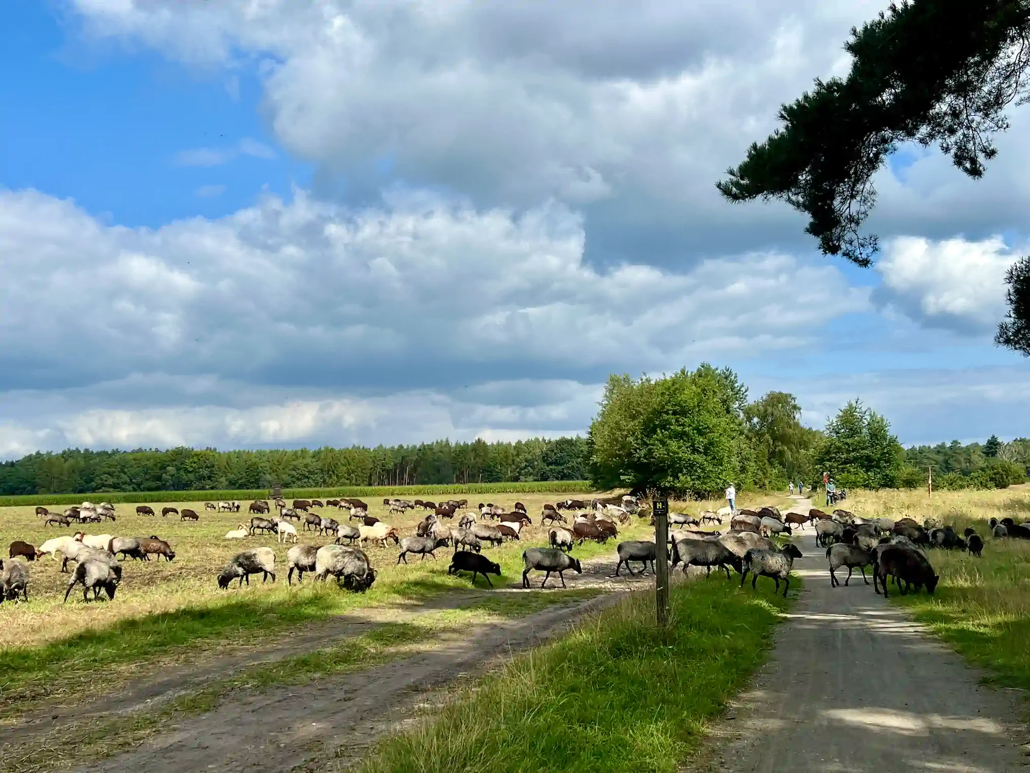Die Schnucken sind nicht ängstlich, aber anfassen lassen sie sich nicht. Von dort geht die Route weiter zur Schmarbecker Heide und dem Fassbarg.