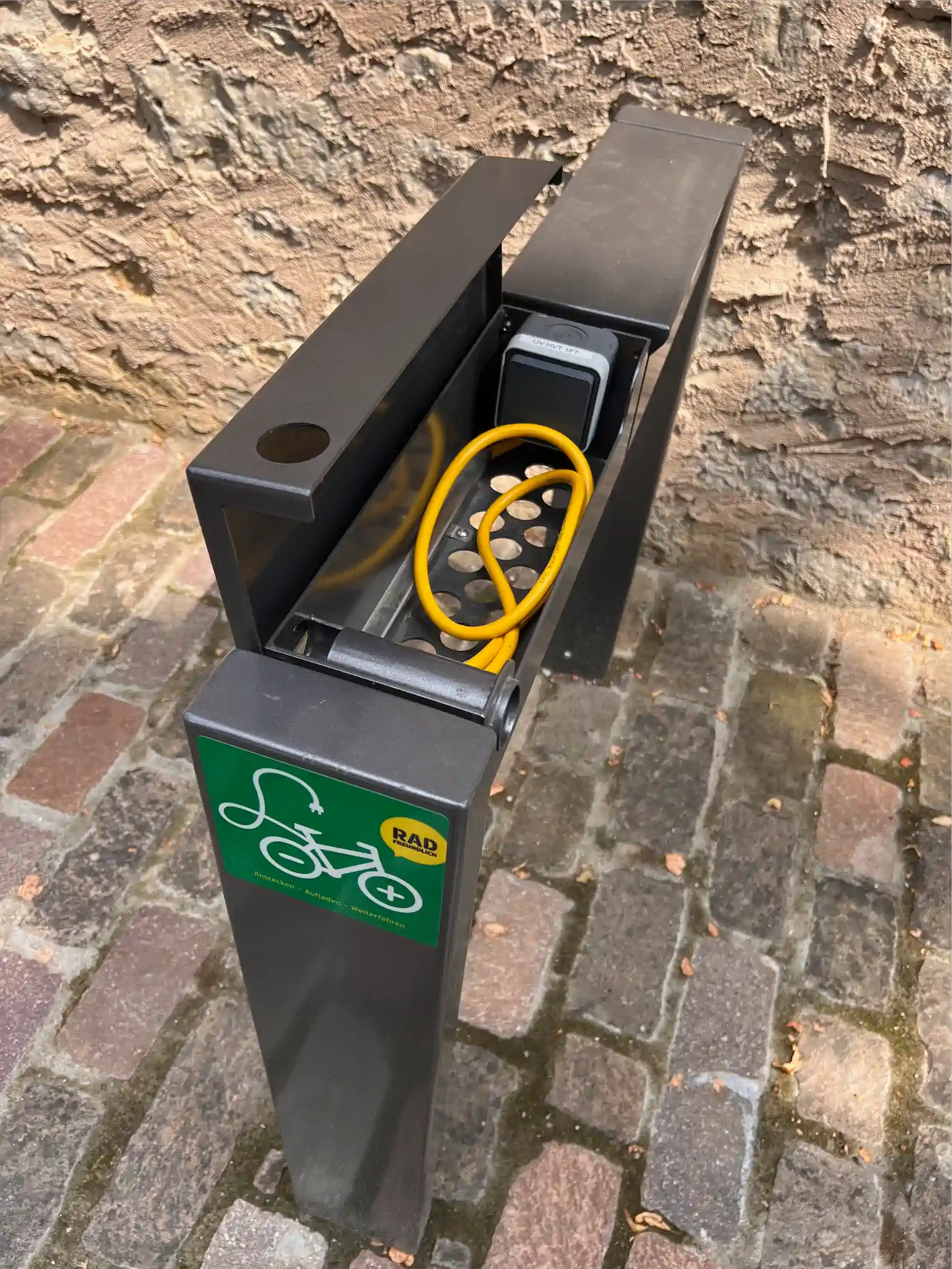 Im Schlosshof gibt es moderne Fahrradständer mit integrierten Steckdosen zum laden.