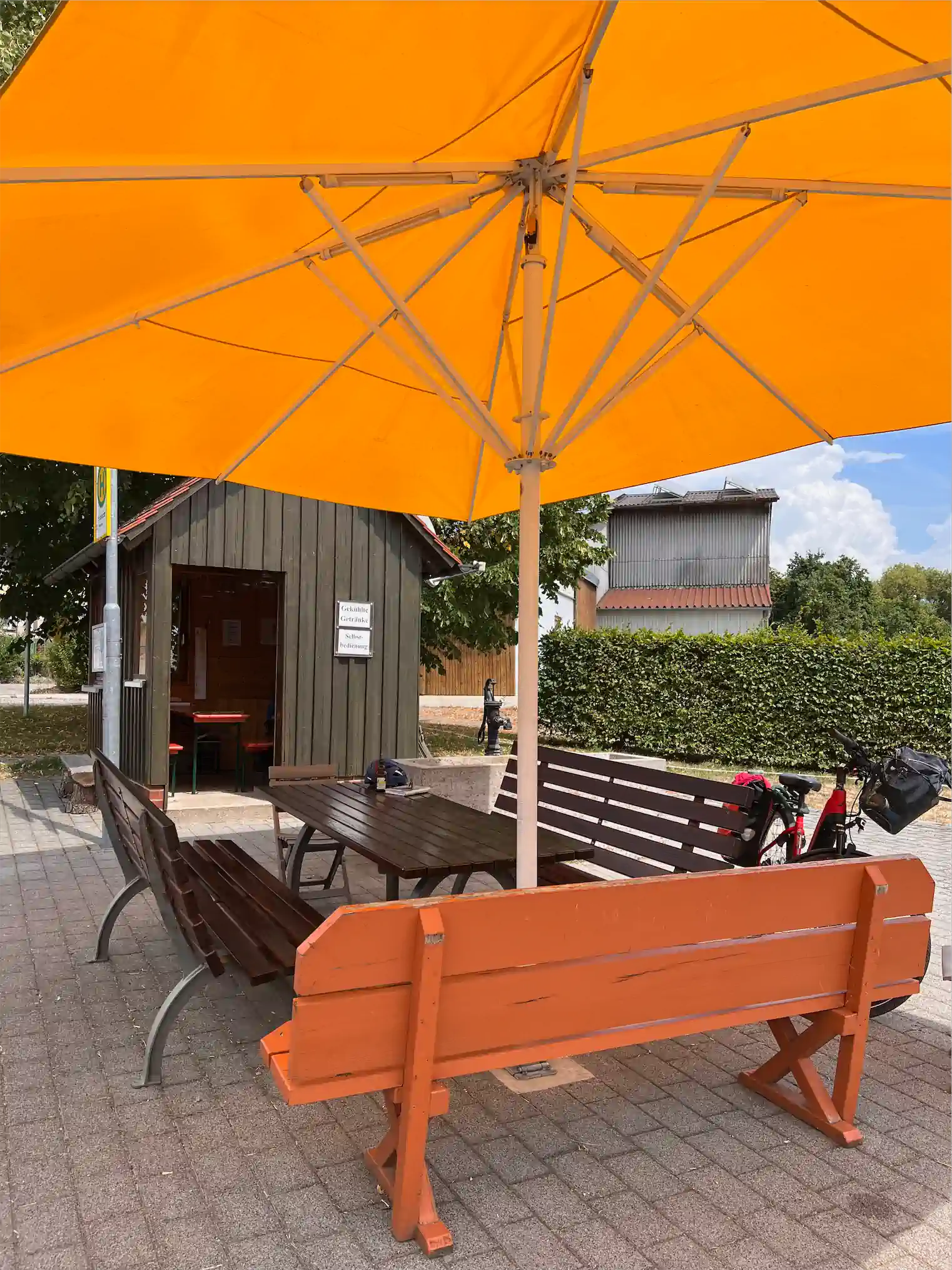 mit immer wieder tollen Aussichten. Ein kleines Highlight erwartet euch im kleinen Dorf Funkstatt. Dort steht mitten im Dorf an der Bushaltestelle eine kleine Hütte mit Rastplatz für Radler. In der Hütte findet Ihr kalte Getränke im Kühlschrank, Landkarten, Fahrradwerkzeug, Öl und eine Erste-Hilfe Box, und ein Gästebuch. Schreibt was rein, die Einwohner freuen sich bestimmt über ein paar nette Worte.